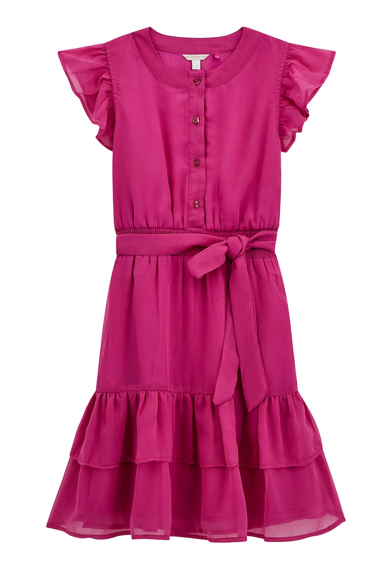 Caracteristici Culoare: roz inchis Stil: casual Material: sintetic Imprimeu: uni Croiala: evazat Lungime maneca: fara maneca Stil decolteu: la baza gatului Sistem inchidere: nasturi Detalii: cordon in talie Colectie: primavara