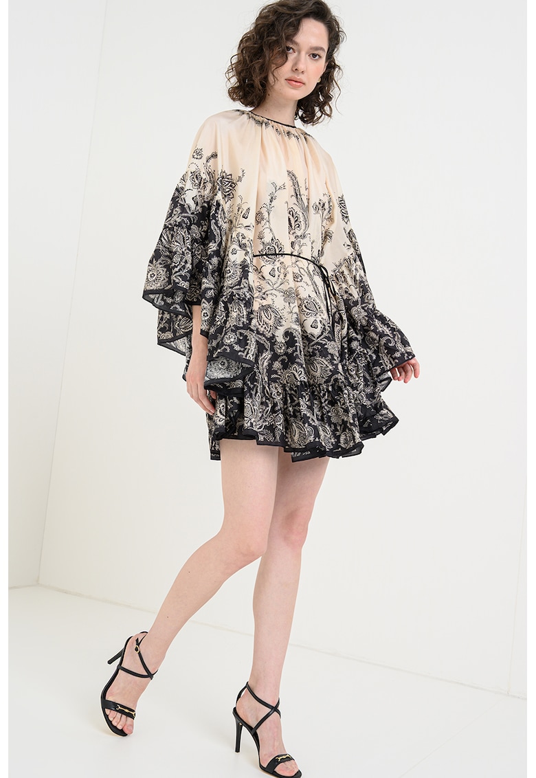 - crem Stil: elegant Material: matase Imprimeu: grafic Croiala: evazat Lungime: midi Decolteu: la baza gatului Lungime maneca: maneca trei sferturi Compozitie Exterior: 100% matase Info model Modelul poarta un produs de marimea S/O IT. Marimi model: 177 cm inaltime