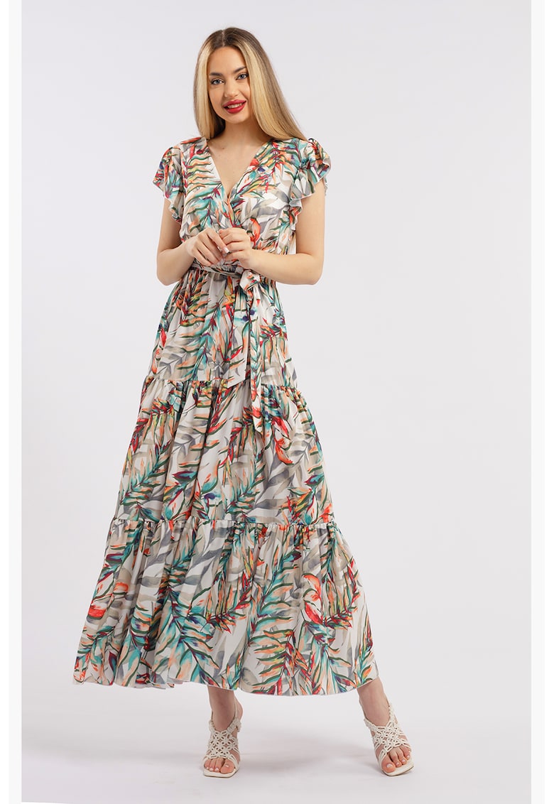 - piele ecologica Imprimeu: grafic Croiala: evazat Lungime: lunga Decolteu: in v Maneci: cu volane Lungime maneca: maneca scurta Talie: cordon subtire in talie Compozitie Exterior: 60% viscoza