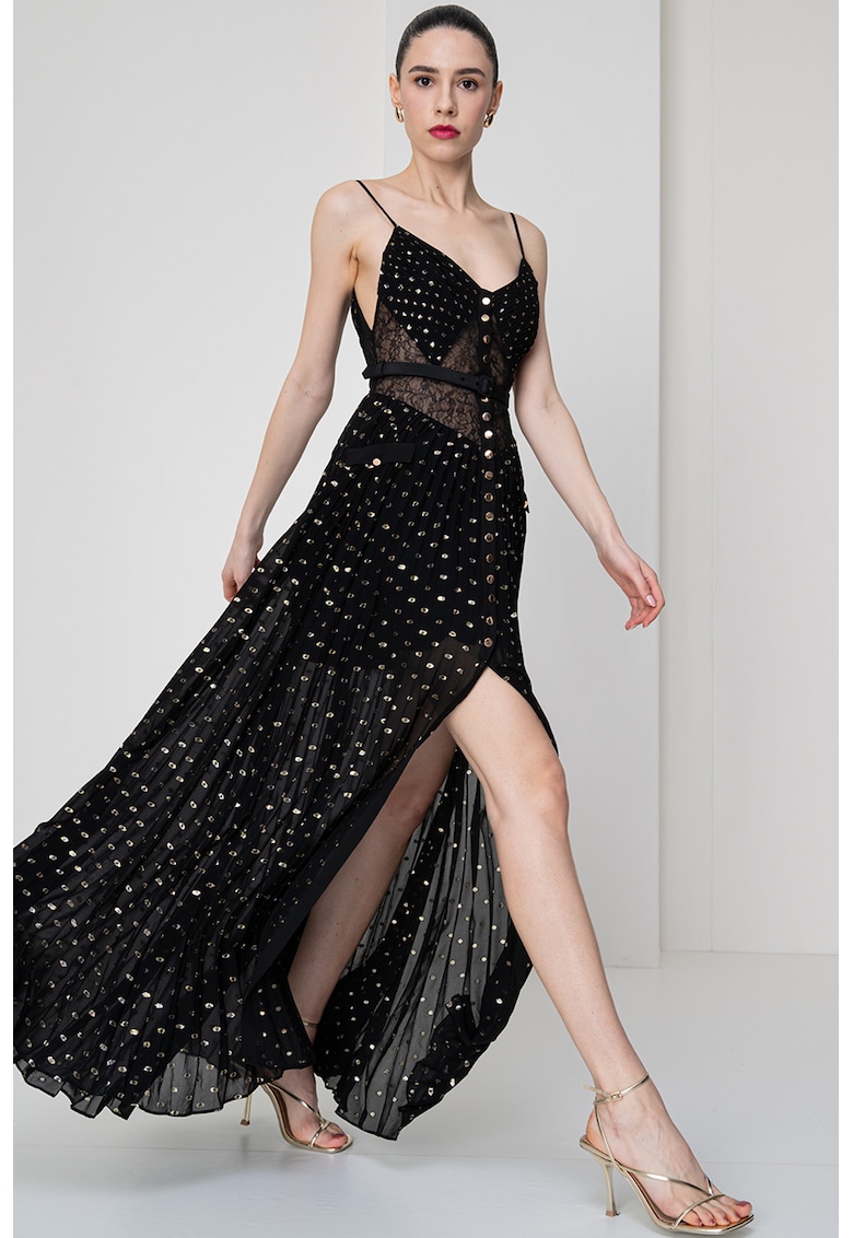 - transparent Stil: elegant Material: viscoza Imprimeu: uni Croiala: evazat Lungime: lunga Decolteu: in v Lungime maneca: fara maneca Compozitie Exterior: 97% viscoza