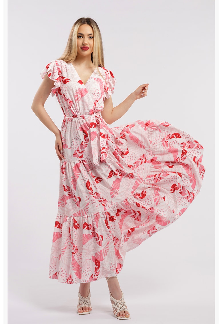 - viscoza Imprimeu: grafic Croiala: evazat Lungime: lunga Decolteu: in v Maneci: cu volane Lungime maneca: maneca scurta Talie: cordon subtire in talie Compozitie Exterior: 60% viscoza
