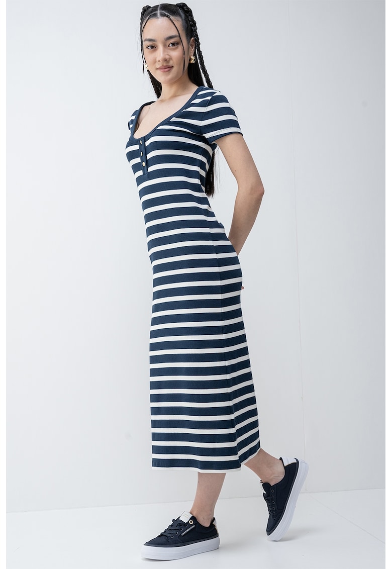 - bleumarin Stil: casual Material: bumbac Imprimeu: dungi Croiala: dreapta Lungime: lunga Decolteu: rotund Lungime maneca: maneca scurta Detalii: aspect striat Compozitie Exterior: 95% bumbac