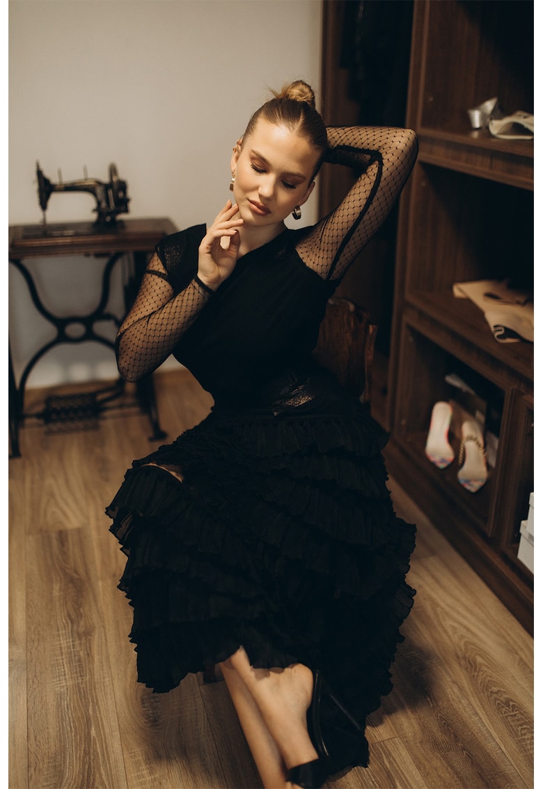 - elastan Imprimeu: uni Croiala: evazat Lungime: lunga Decolteu: la baza gatului Maneci: semitransparente Lungime maneca: maneca lunga Detalii: volane Compozitie Exterior: 60% poliester