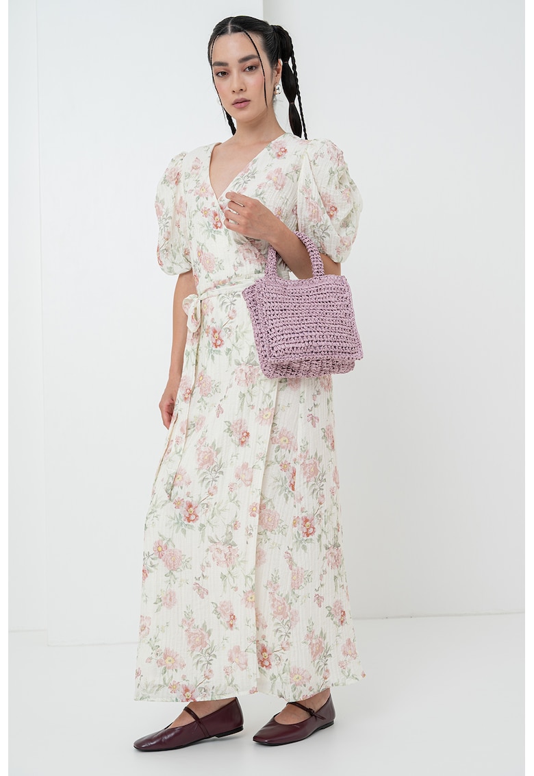 - poliamida Imprimeu: floral Croiala: in a Lungime: lunga Decolteu: cache coeur Maneci: bufante Lungime maneca: maneca medie Detalii: aspect striat Sistem inchidere: cordon Compozitie Exterior: 80% viscoza