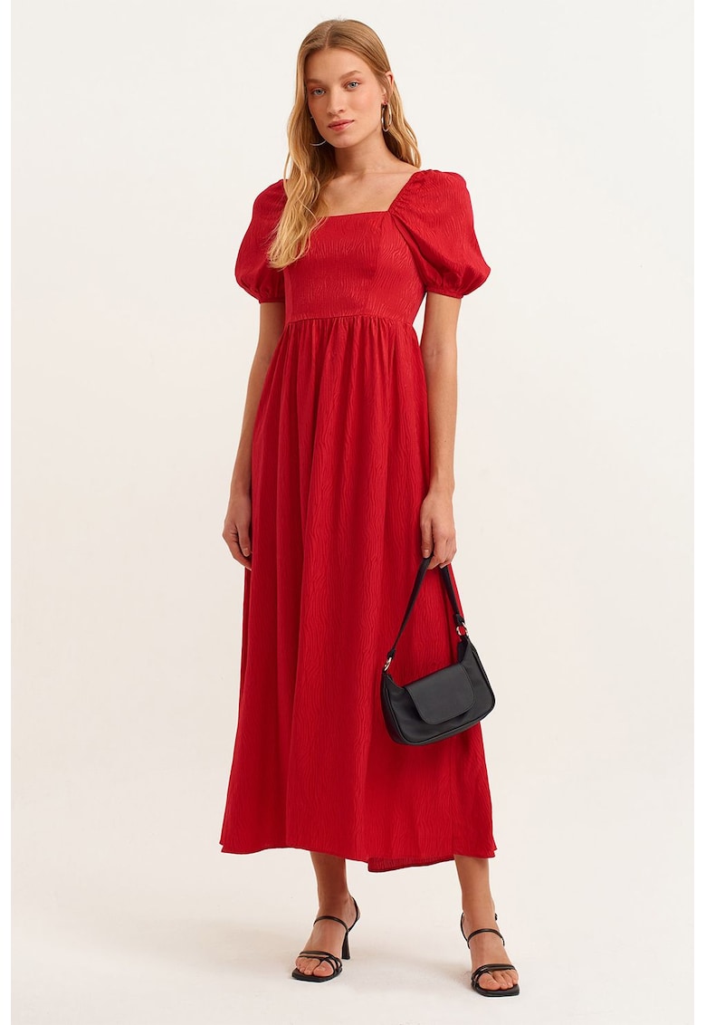 Caracteristici Culoare: rosu Stil: casual Material: sintetic Imprimeu: uni Croiala: evazat Lungime: lunga Decolteu: patrat Maneci: bufante Lungime maneca: maneca scurta Sistem inchidere: fara inchidere Compozitie Exterior: 65% poliester