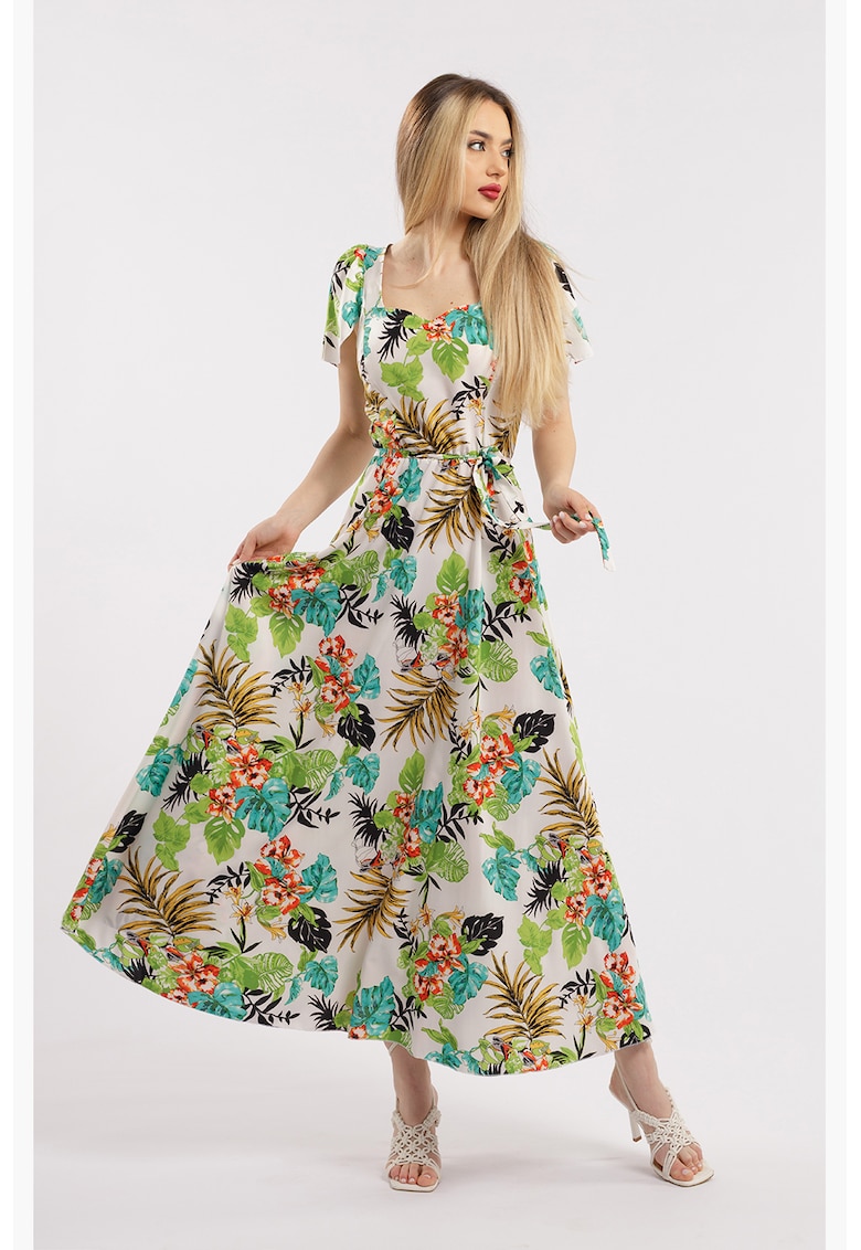 - viscoza Imprimeu: floral Croiala: in a Lungime: lunga Decolteu: sweetheart Lungime maneca: maneca scurta Talie: cordon subtire in talie Compozitie Exterior: 60% viscoza