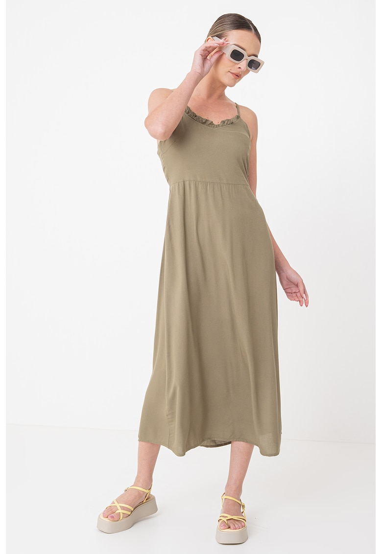 Caracteristici Culoare: verde feriga Stil: casual Material: viscoza Imprimeu: uni Croiala: dreapta Lungime: lunga Decolteu: rotund Lungime maneca: fara maneca Compozitie Exterior: 100% viscoza lenzing™ecovero™ Info model Modelul poarta un produs de marimea S. Marimi model: 174 cm inaltime