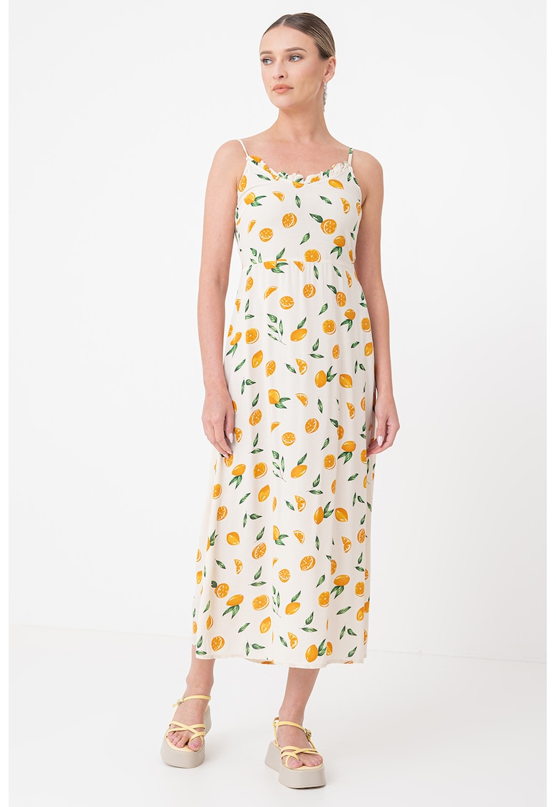 - crem Stil: casual Material: viscoza Imprimeu: fructe Croiala: dreapta Lungime: lunga Decolteu: rotund Lungime maneca: fara maneca Compozitie Exterior: 100% viscoza lenzing™ecovero™ Info model Modelul poarta un produs de marimea S. Marimi model: 174 cm inaltime