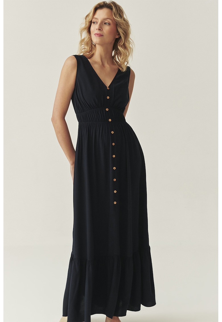 Caracteristici Culoare: negru Stil: casual Material: viscoza Imprimeu: uni Croiala: in a Lungime: lunga Decolteu: in v Lungime maneca: fara maneca Talie: elastica Detalii: terminatie cu volan Sistem inchidere: nasturi Compozitie Exterior: 88% viscoza
