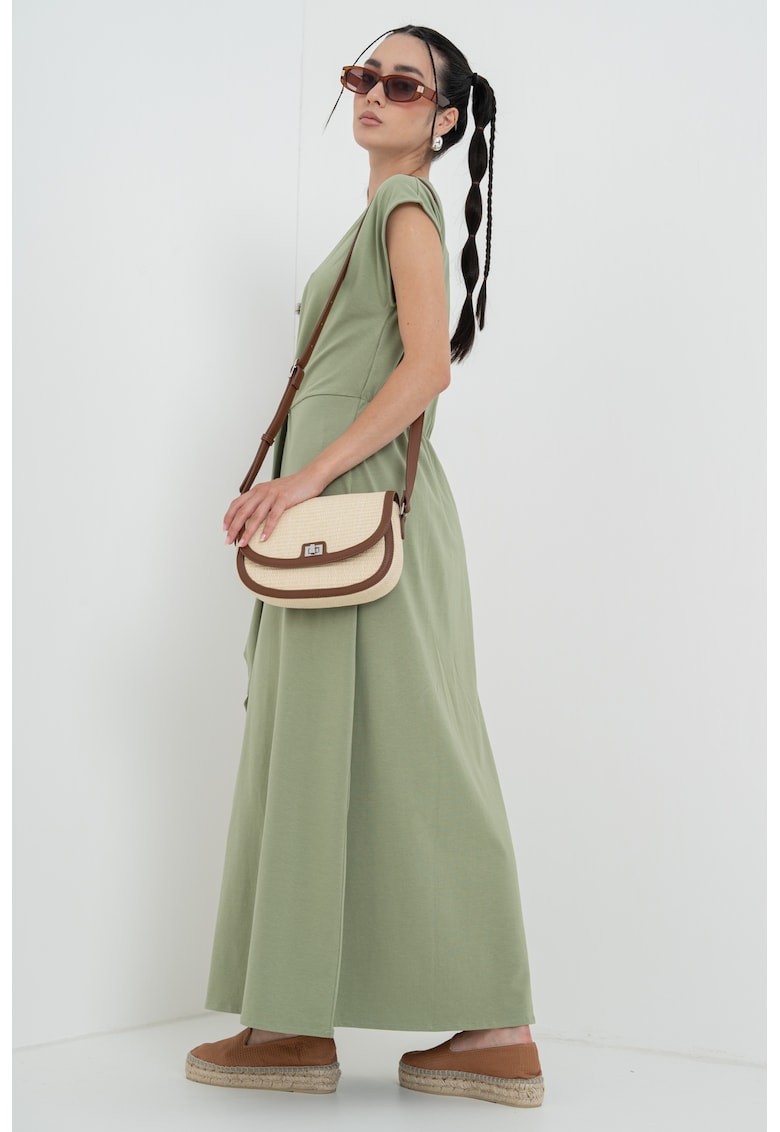 Caracteristici Culoare: verde militar prafuit Stil: casual Material: bumbac Imprimeu: uni Croiala: evazat Lungime: lunga Decolteu: in v Lungime maneca: maneca scurta Compozitie Exterior: 94% bumbac