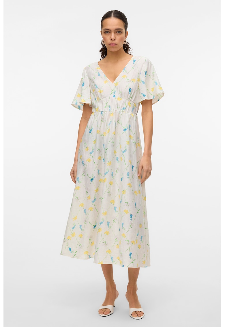 - in Imprimeu: floral Croiala: evazat Lungime: lunga Decolteu: in v Maneci: fluture Lungime maneca: maneca scurta Sistem inchidere: siret Compozitie Exterior: 75% viscoza lenzing™ecovero™