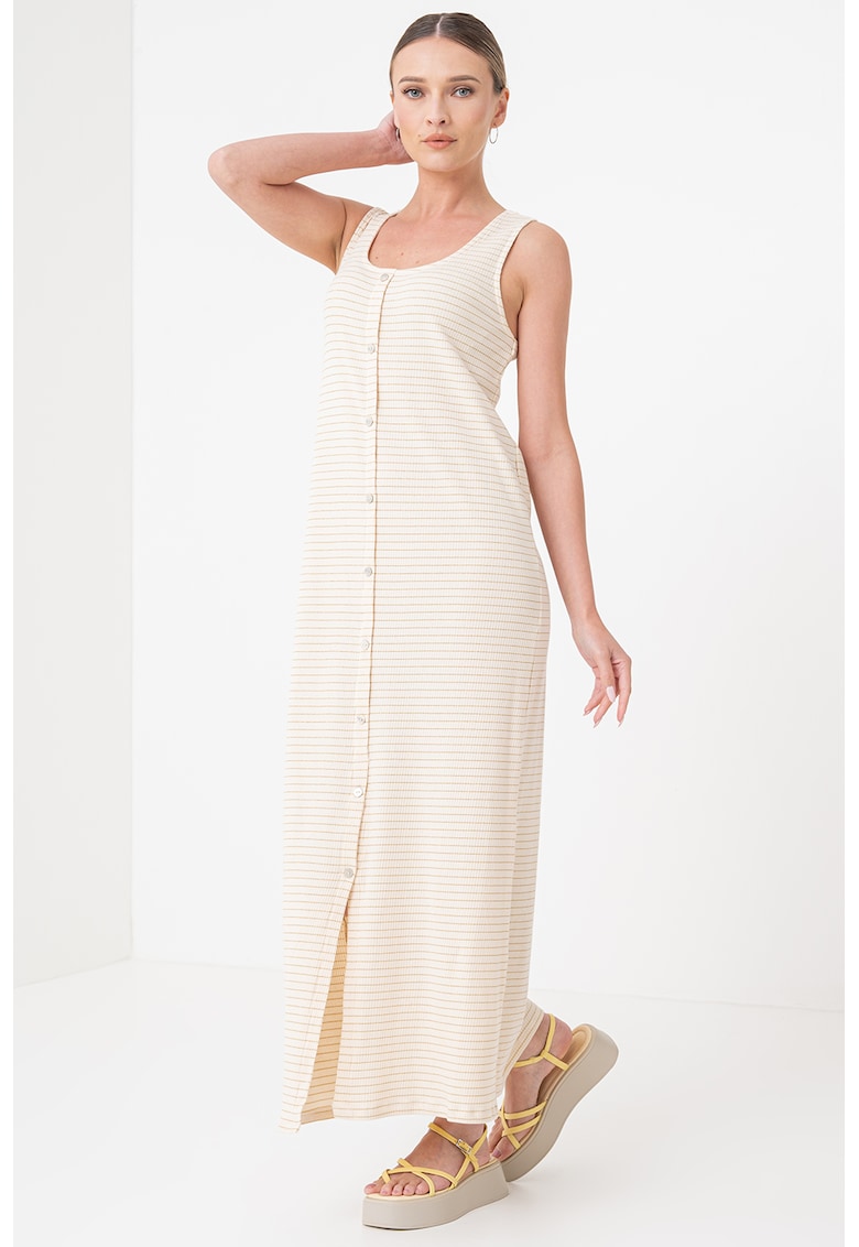 Caracteristici Culoare: alb fildes Stil: casual Material: bumbac Imprimeu: dungi Croiala: lejer Lungime: lunga Decolteu: patrat Lungime maneca: fara maneca Sistem inchidere: nasturi Compozitie Exterior: 89% bumbac
