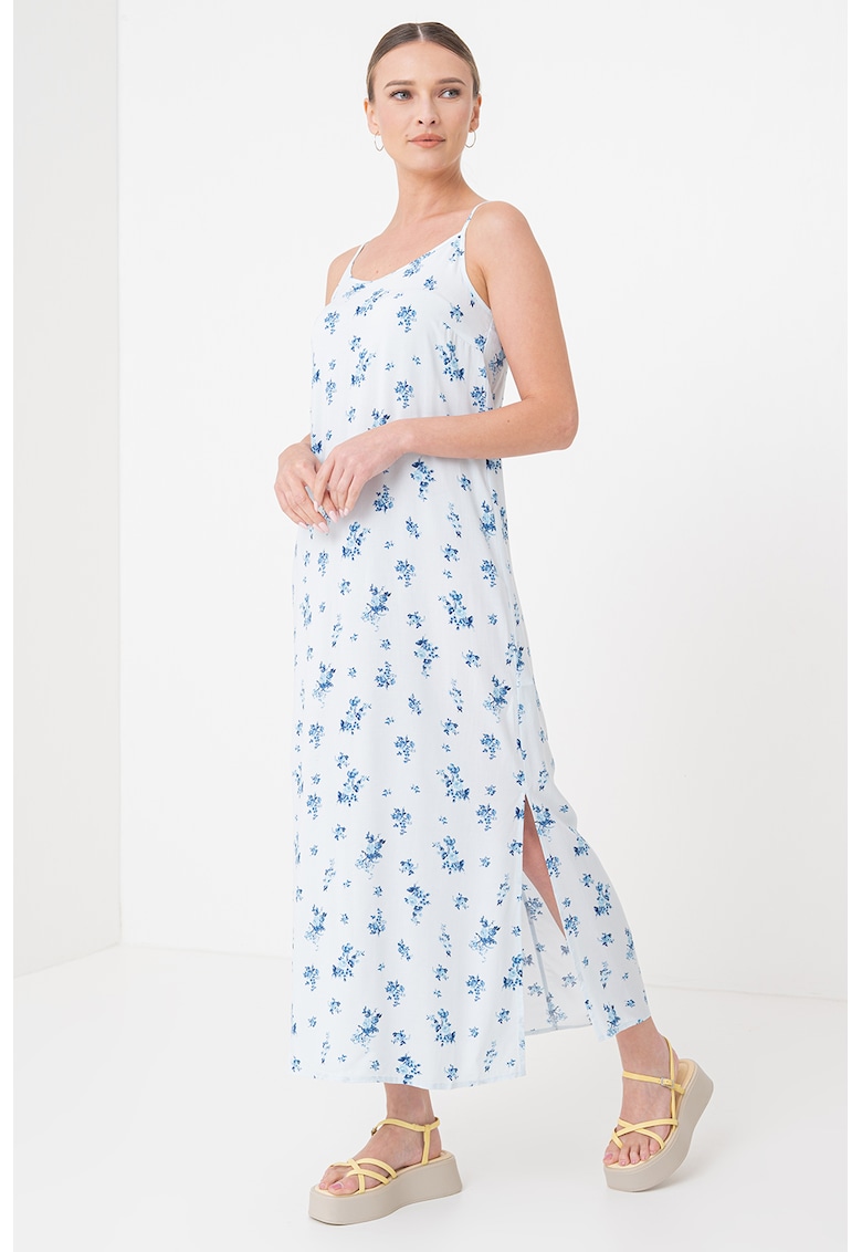 - albastru Stil: casual Material: viscoza Imprimeu: floral Croiala: dreapta Lungime: lunga Decolteu: rotund Barete: inguste Lungime maneca: fara maneca Compozitie Exterior: 100% viscoza Info model Modelul poarta un produs de marimea S. Marimi model: 174 cm inaltime