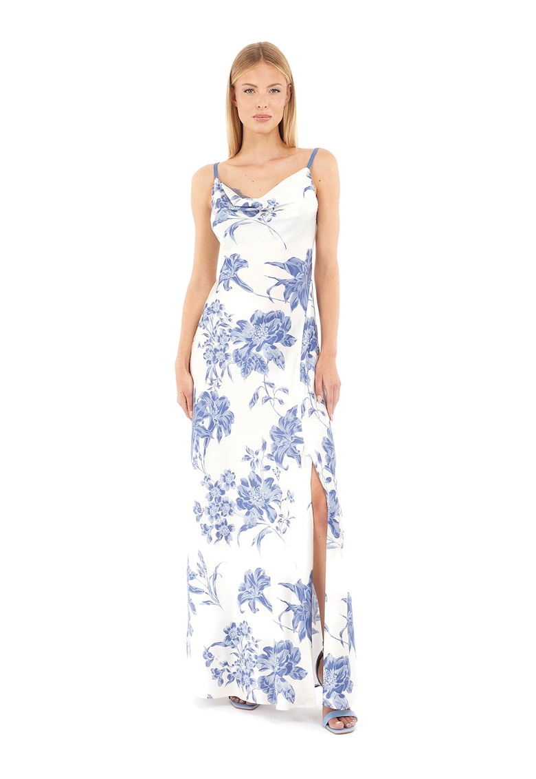 - albastru prafuit Stil: elegant Material: poliester Imprimeu: floral Croiala: evazat Lungime: lunga Barete: inguste Lungime maneca: fara maneca Detalii: slit pe partea din fata Compozitie Exterior: 96% poliester