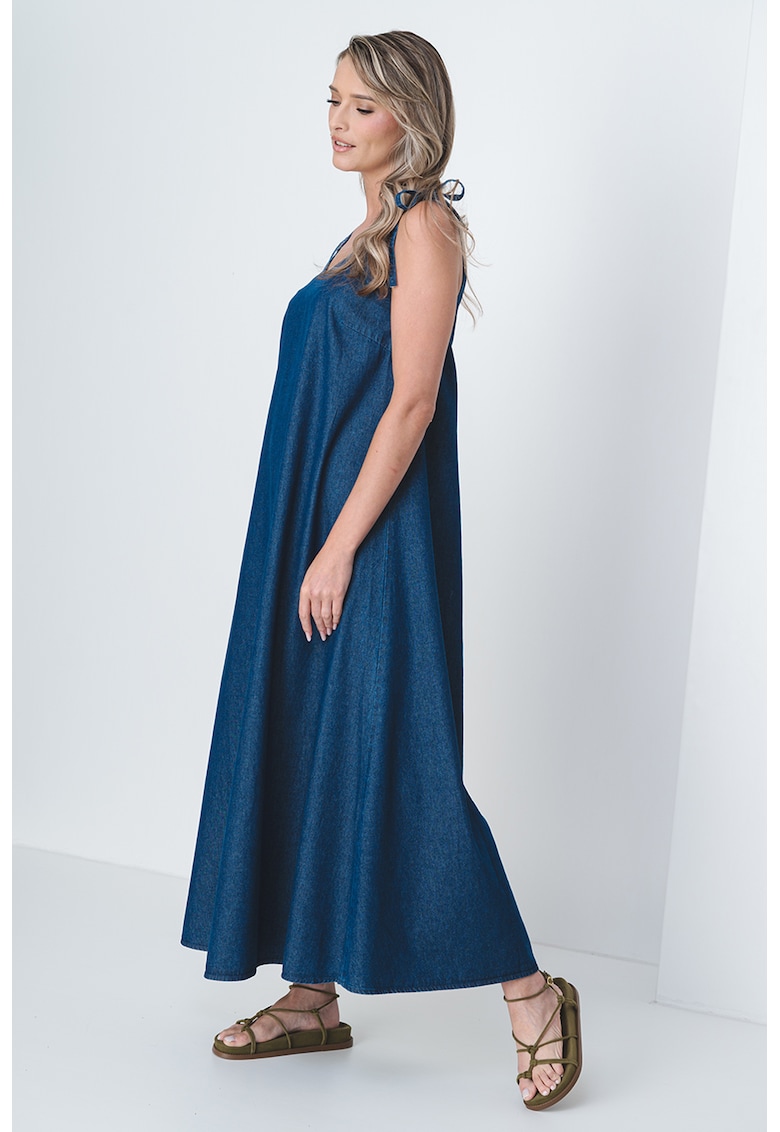 Caracteristici Culoare: albastru inchis melange Stil: casual Material: denim Imprimeu: uni Croiala: dreapta Lungime: lunga Decolteu: in v Barete: inguste