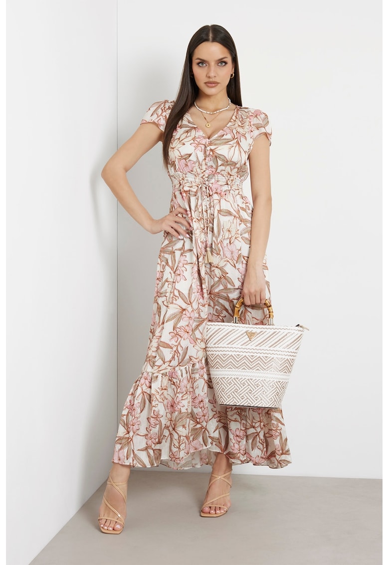 - crem Stil: casual Material: poliester Imprimeu: floral Croiala: evazat Lungime: lunga Decolteu: in v Lungime maneca: maneca scurta Detalii: slit lateral