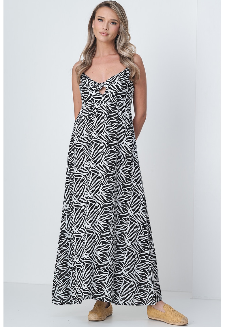 - negru Stil: casual Material: viscoza Imprimeu: abstract Croiala: evazat Lungime: lunga Decolteu: in v Lungime maneca: fara maneca Detalii: material vaporos Sistem inchidere: fermoar Compozitie Exterior: 100% viscoza lenzing™ecovero™ Info model Modelul poarta un produs de marimea S. Marimi model: 174 cm inaltime
