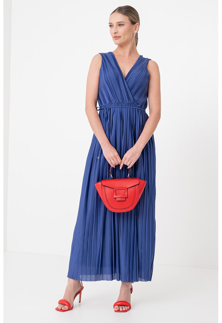 Caracteristici Culoare: albastru lavanda Stil: casual Material: sintetic Imprimeu: uni Croiala: evazat Lungime: lunga Decolteu: cache-coeur Lungime maneca: fara maneca Detalii: decolteu in v pe partea din spate
