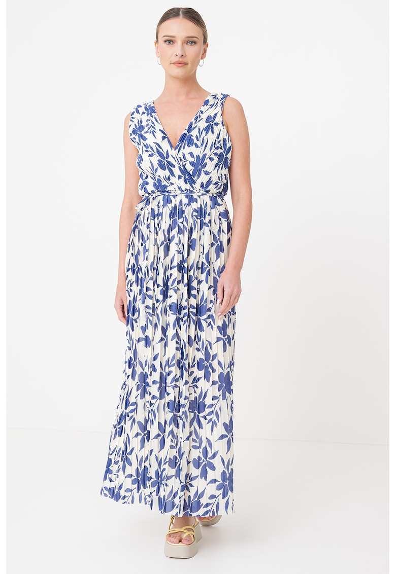 - alb murdar Stil: casual Material: sintetic Imprimeu: floral Croiala: evazat Lungime: lunga Decolteu: cache-coeur Lungime maneca: fara maneca Detalii: decolteu in v pe partea din spate
