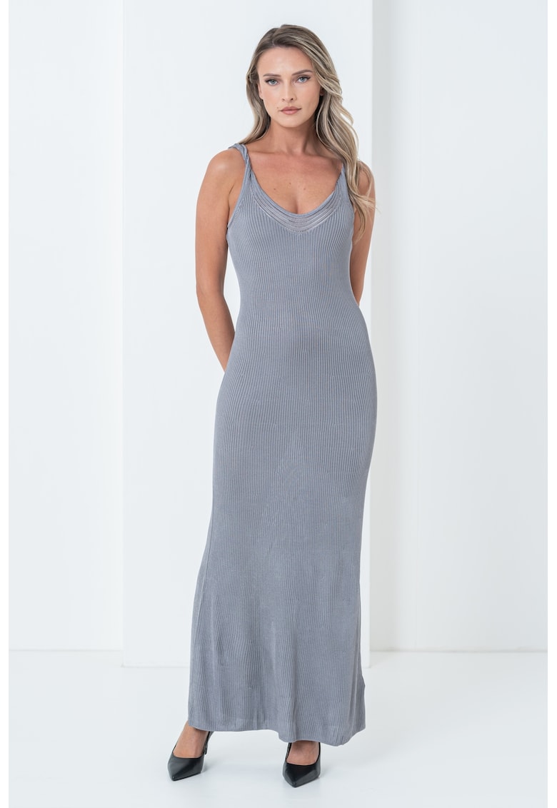 Caracteristici Culoare: gri inchis Stil: casual Material: viscoza Imprimeu: uni Croiala: bodycon Lungime: lunga Decolteu: in v Barete: aspect rasucit Lungime maneca: fara maneca Sistem inchidere: fara inchidere Compozitie Exterior: 100% viscoza Info model Modelul poarta un produs de marimea S. Marimi model: 174 cm inaltime