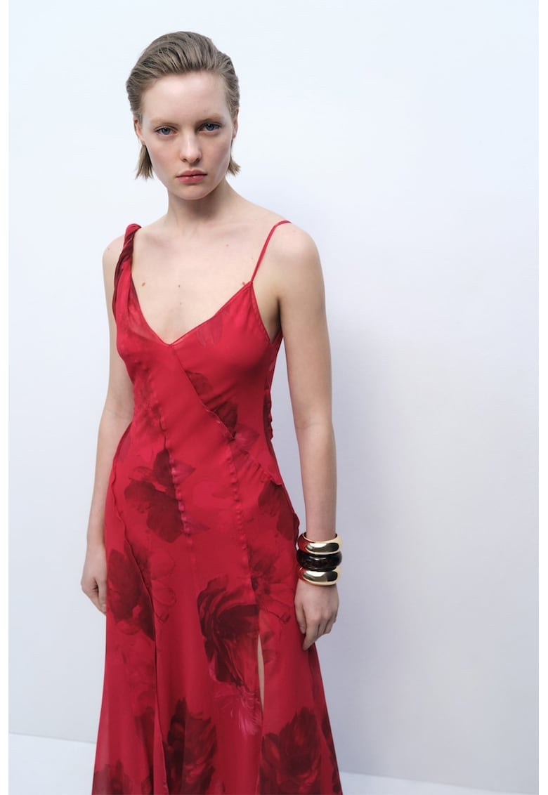 - plasa Imprimeu: floral Croiala: evazat Lungime: midi Decolteu: in v Lungime maneca: fara maneca Sistem inchidere: fara inchidere Compozitie Exterior: 100% poliester Captuseala: 100% poliester
