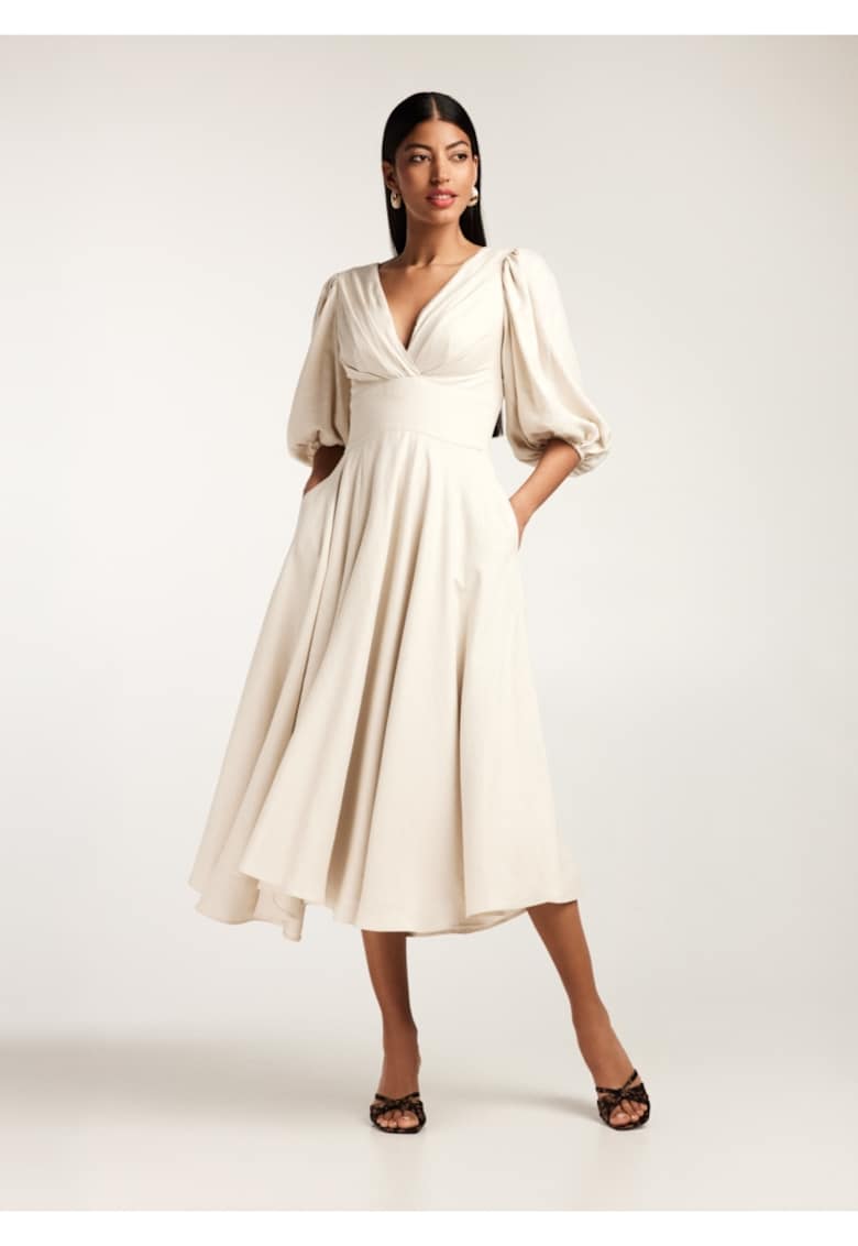Caracteristici Culoare: bej deschis Stil: elegant Material: in Imprimeu: uni Croiala: evazat Lungime: midi Decolteu: cache-coeur Lungime maneca: maneca medie Talie: cambrata Buzunare: 2 laterale Detalii: decolteu in v pe partea din spate Sistem inchidere: fermoar Compozitie Exterior: 55% in