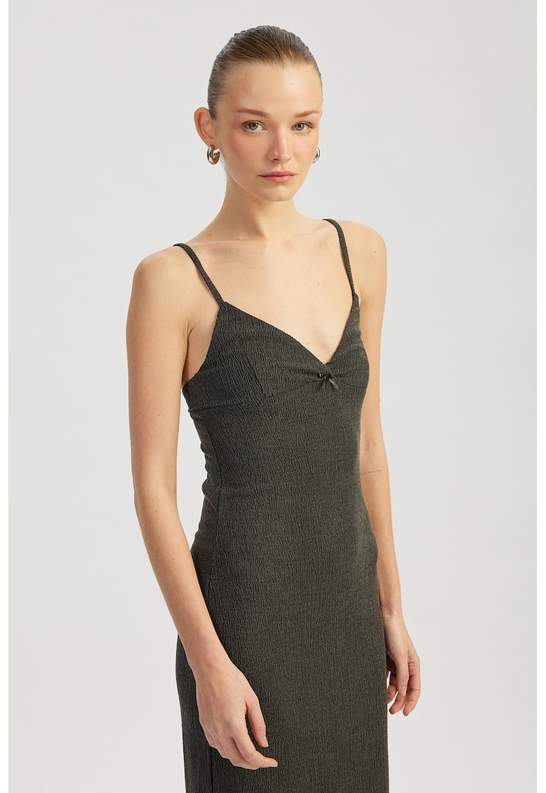 - viscoza Imprimeu: uni Croiala: cambrata Lungime: midi Decolteu: in v Barete: ajustabile