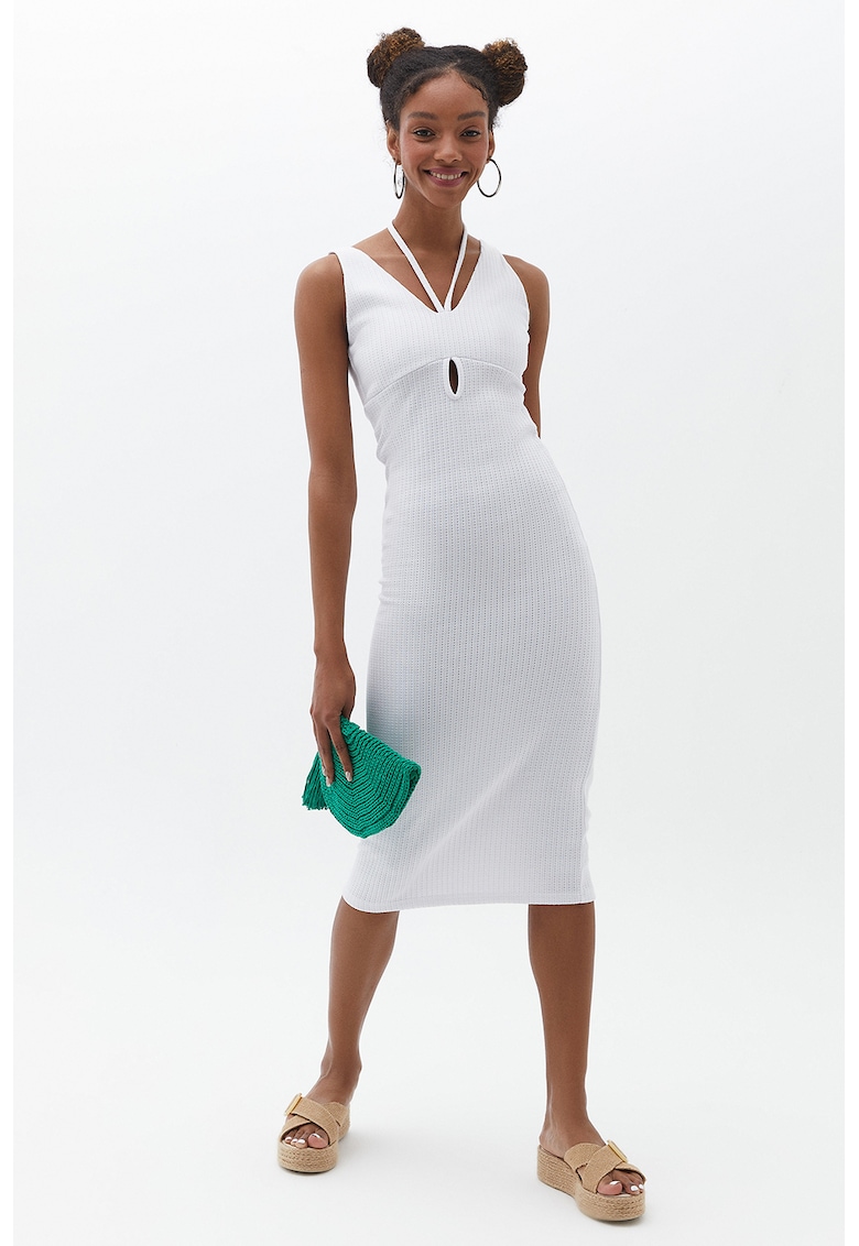 - viscoza Imprimeu: uni Croiala: cambrata Lungime: midi Decolteu: in v Lungime maneca: fara maneca Sistem inchidere: siret Compozitie Exterior: 63% poliester