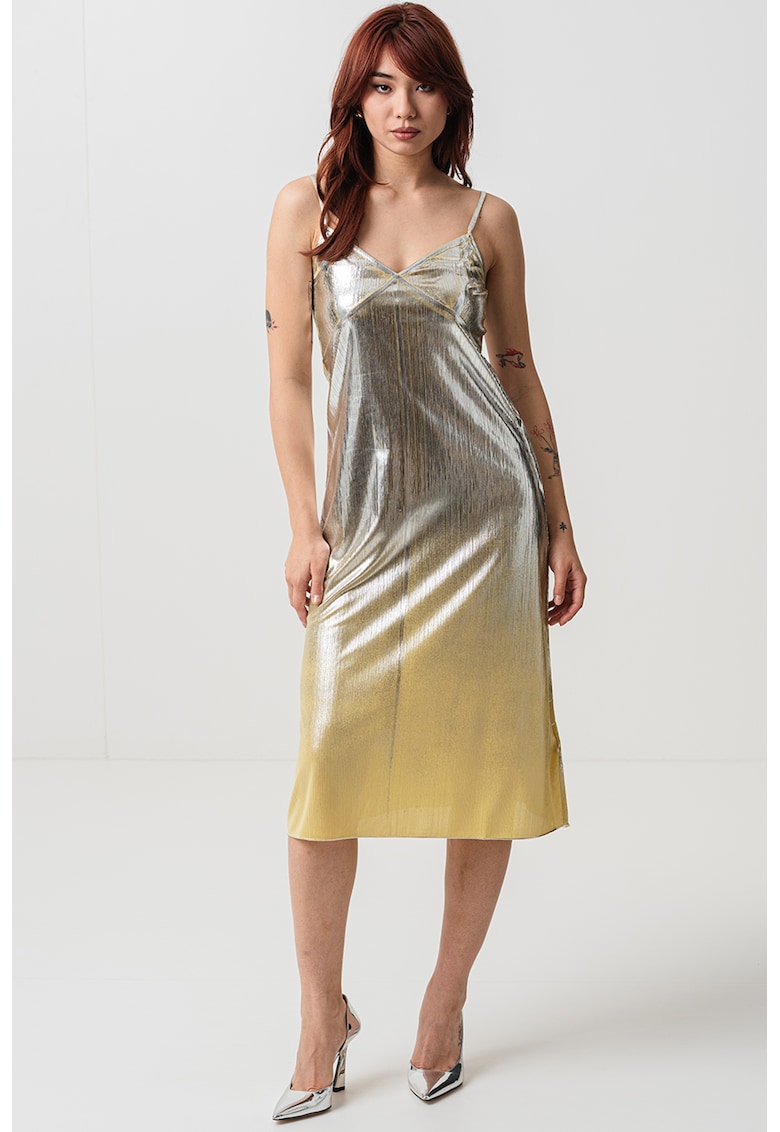 - argintiu Stil: elegant Material: sintetic Imprimeu: tie-dye Croiala: dreapta Lungime: midi Decolteu: in v Barete: 2 inguste Lungime maneca: fara maneca Sistem inchidere: fara inchidere Compozitie Exterior: 97% poliester
