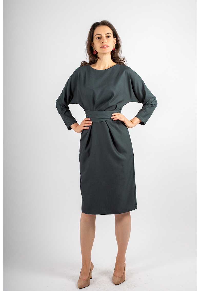 - viscoza Imprimeu: uni Croiala: dreapta Lungime: midi Decolteu: rotund Maneci: liliac Lungime maneca: maneca lunga Detalii: cordon in talie Sistem inchidere: fermoar Compozitie Exterior: 70% poliester