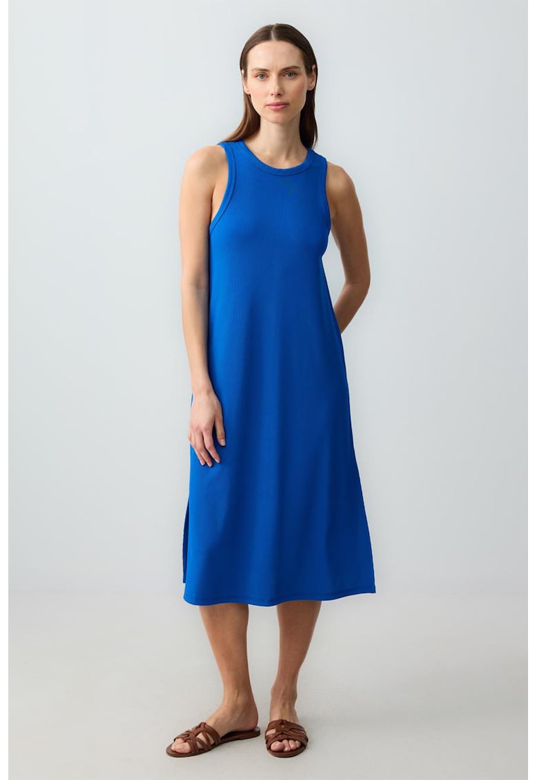 Caracteristici Culoare: albastru royal Stil: casual Material: poliester Imprimeu: uni Croiala: dreapta Lungime: midi Decolteu: la baza gatului Lungime maneca: fara maneca Detalii: slit lateral Sistem inchidere: fara inchidere Compozitie Exterior: 92% poliester