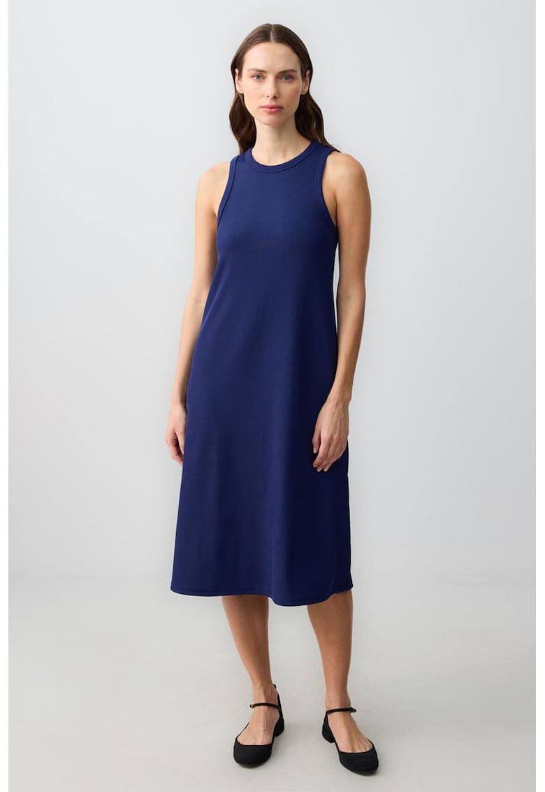 Caracteristici Culoare: bleumarin Stil: casual Material: poliester Imprimeu: uni Croiala: dreapta Lungime: midi Decolteu: la baza gatului Lungime maneca: fara maneca Detalii: slit lateral Sistem inchidere: fara inchidere Compozitie Exterior: 92% poliester