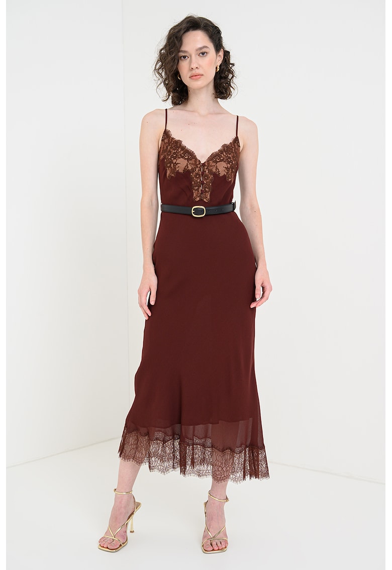 Caracteristici Culoare: maro inchis Stil: elegant Material: viscoza Imprimeu: uni Croiala: pe bie Lungime: midi Decolteu: in "v" Barete: 2 bretele foarte subtiri si ajustabile Lungime maneca: fara maneca Detalii: detalii din dantela