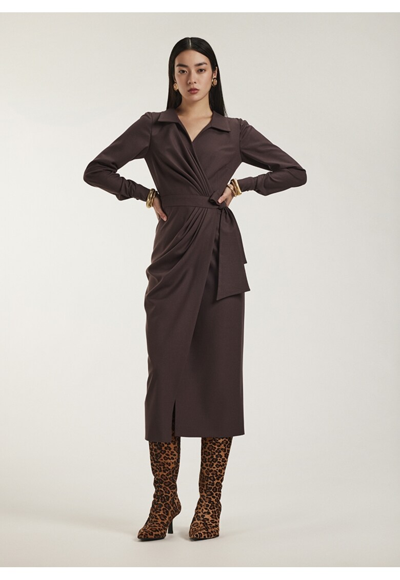 Caracteristici Culoare: maro inchis Stil: casual Material: poliester Imprimeu: uni Croiala: petrecuta Lungime: midi Decolteu: in v Lungime maneca: maneca lunga Detalii: design petrecut Sistem inchidere: fara inchidere Compozitie Exterior: 63% poliester
