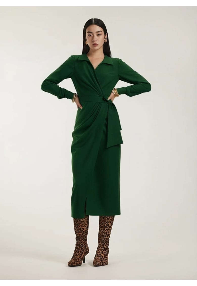 Caracteristici Culoare: verde englez Stil: casual Material: poliester Imprimeu: uni Croiala: petrecuta Lungime: midi Decolteu: in v Lungime maneca: maneca lunga Detalii: design petrecut Sistem inchidere: fara inchidere Compozitie Exterior: 63% poliester