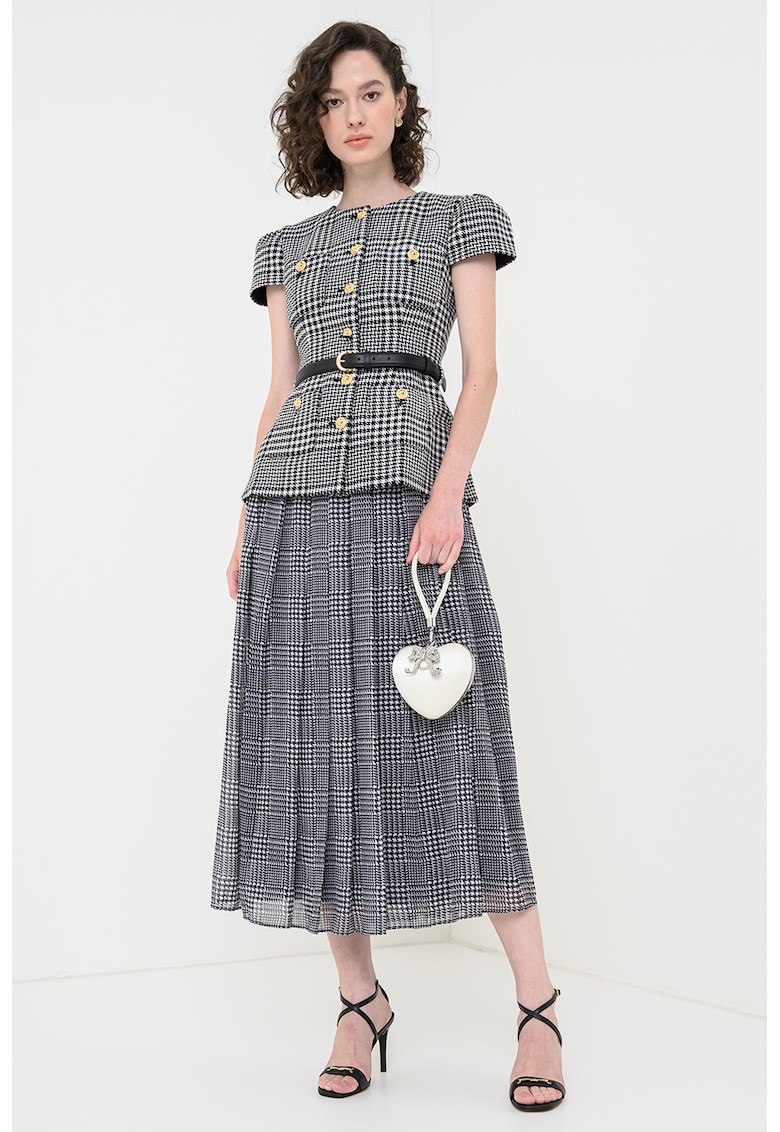 - lana Imprimeu: carouri Croiala: evazat Lungime: midi Decolteu: la baza gatului Lungime maneca: maneca scurta Talie: curea Detalii: nasturi decorativi