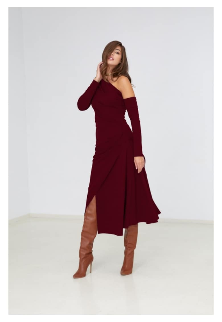 Caracteristici Culoare: rosu rubiniu Stil: elegant Material: rayon Imprimeu: uni Croiala: asimetric Lungime: midi Decolteu: decolteu pe un umar Lungime maneca: maneca lunga Talie: cambrata Detalii: design drapat Sistem inchidere: fermoar Compozitie Exterior: 60% rayon