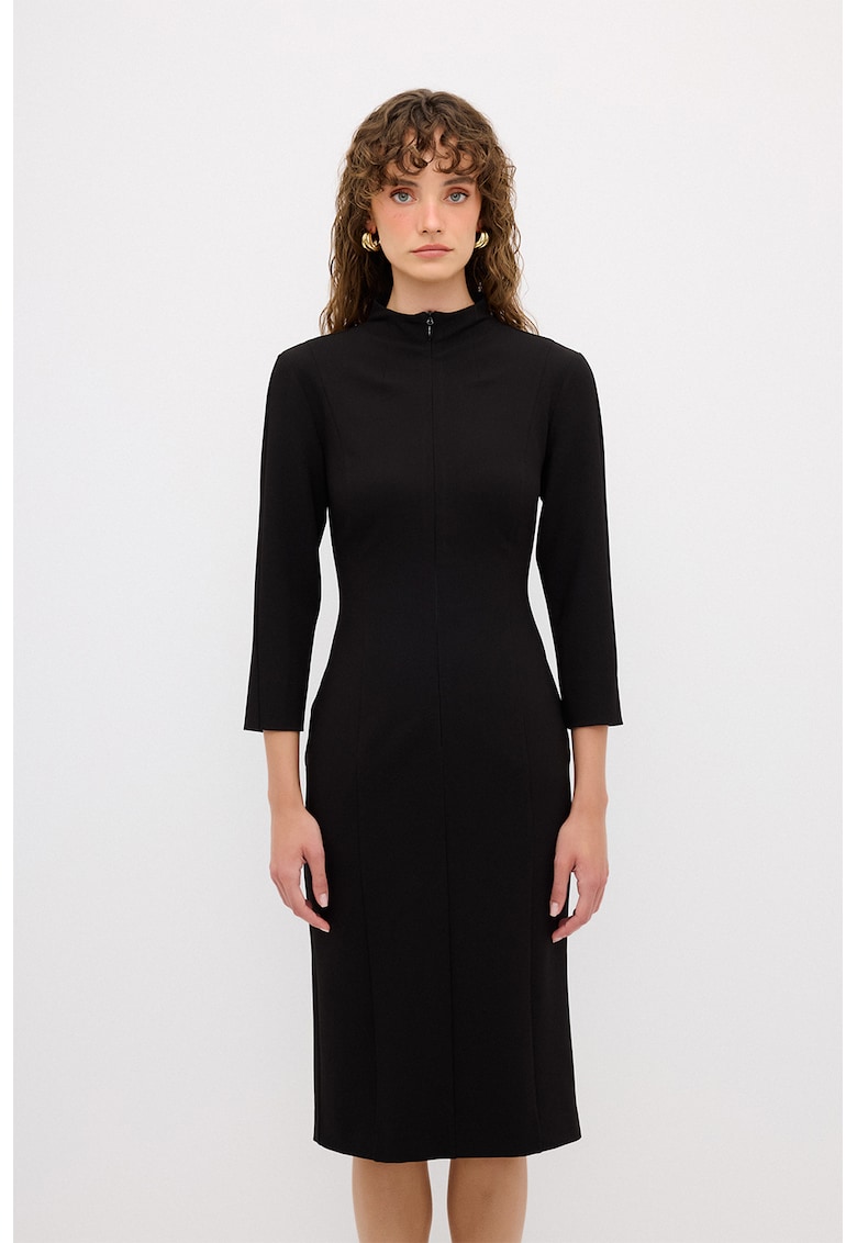 Caracteristici Culoare: negru Stil: elegant Material: sintetic Imprimeu: uni Croiala: dreapta Lungime: midi Guler: fenta cu fermoar
