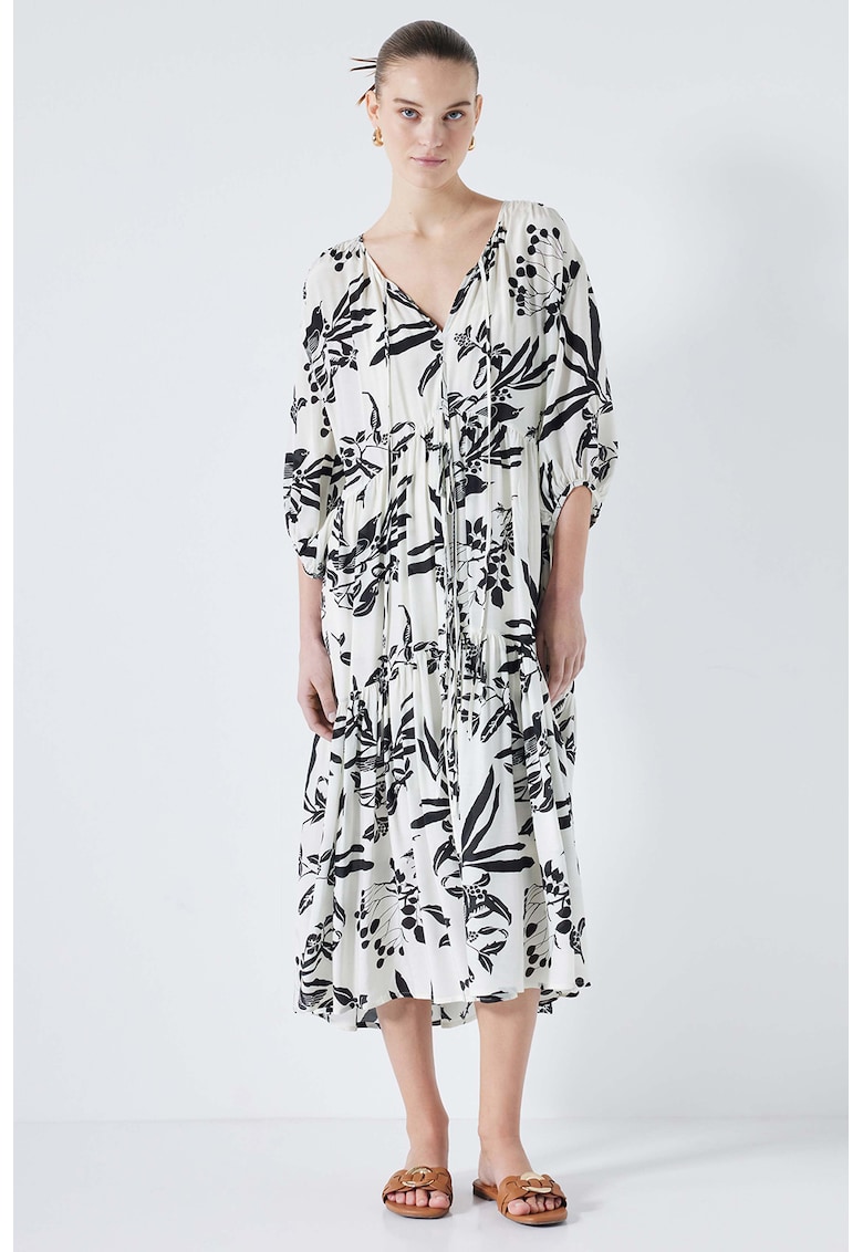 - negru Stil: casual Material: viscoza Imprimeu: floral Croiala: dreapta Lungime: midi Decolteu: in v cu cordoane Lungime maneca: maneca trei sferturi Detalii: terminatie cu volan Sistem inchidere: fara inchidere Compozitie Exterior: 100% viscoza