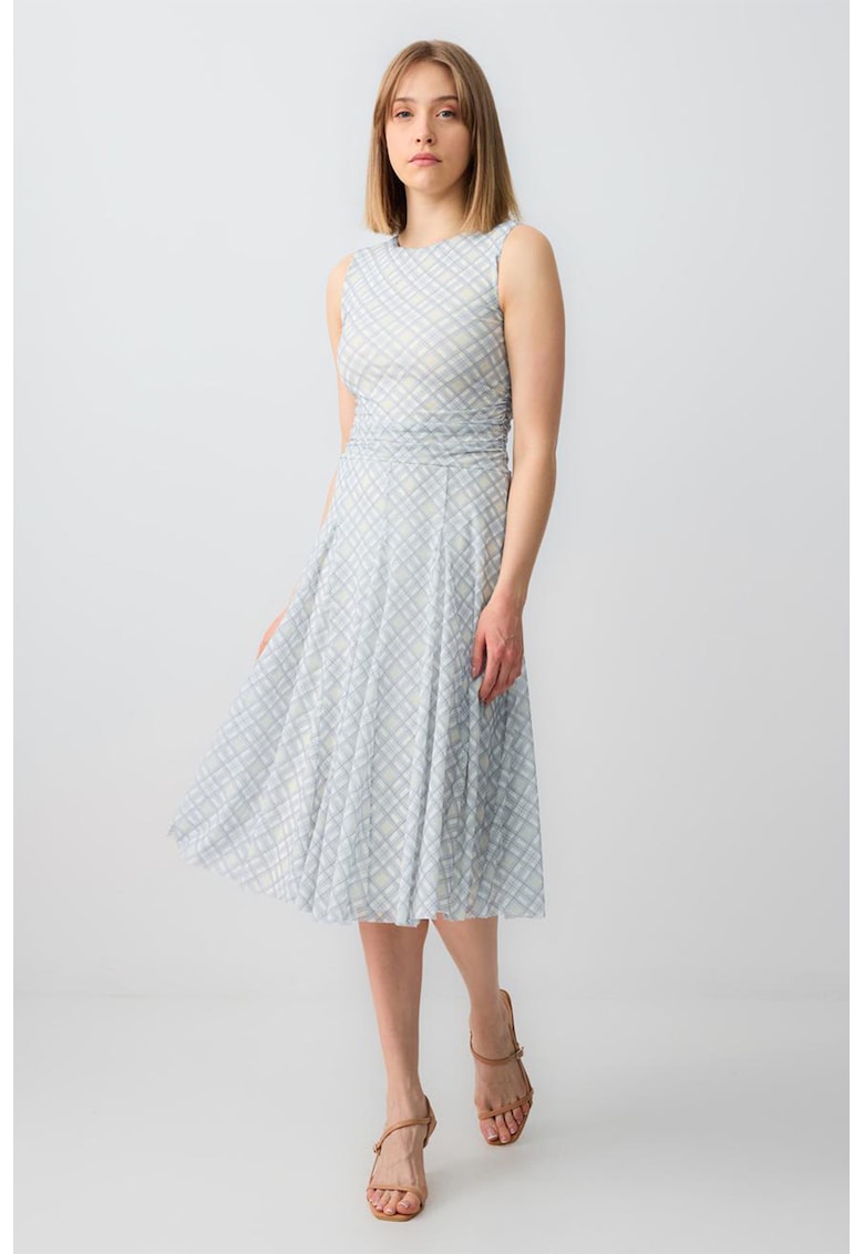 - bej deschis Stil: elegant Material: poliester Imprimeu: carouri Croiala: evazat Lungime: midi Decolteu: la baza gatului Lungime maneca: fara maneca Talie: drapata Compozitie Exterior: 95% poliester