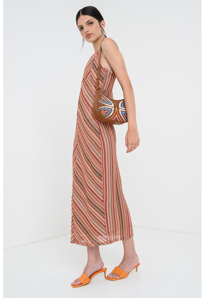 - portocaliu Stil: casual Material: sintetic Imprimeu: dungi Croiala: evazat Lungime: midi Decolteu: in v Lungime maneca: fara maneca Compozitie Exterior: 98% poliester reciclat