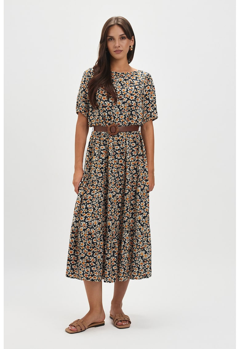 - portocaliu deschis Stil: casual Material: viscoza Imprimeu: floral Croiala: lejer Lungime: midi Decolteu: barcuta Lungime maneca: maneca medie Sistem inchidere: fara inchidere Compozitie Exterior: 100% viscoza