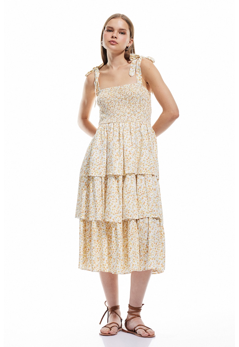 - verde sparanghel Stil: casual Material: viscoza Imprimeu: floral Croiala: evazat Lungime: midi Decolteu: patrat Lungime maneca: fara maneca Sistem inchidere: fara inchidere Compozitie Exterior: 100% viscoza