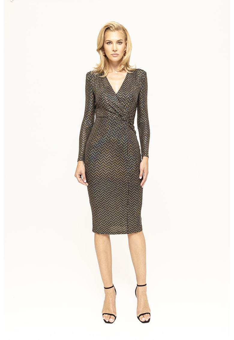 - gri inchis Stil: elegant Material: sintetic Imprimeu: uni Croiala: cambrata Lungime: midi Decolteu: cache-coeur Lungime maneca: maneca lunga Detalii: aplicatii cu paiete Compozitie Exterior: 83% poliester