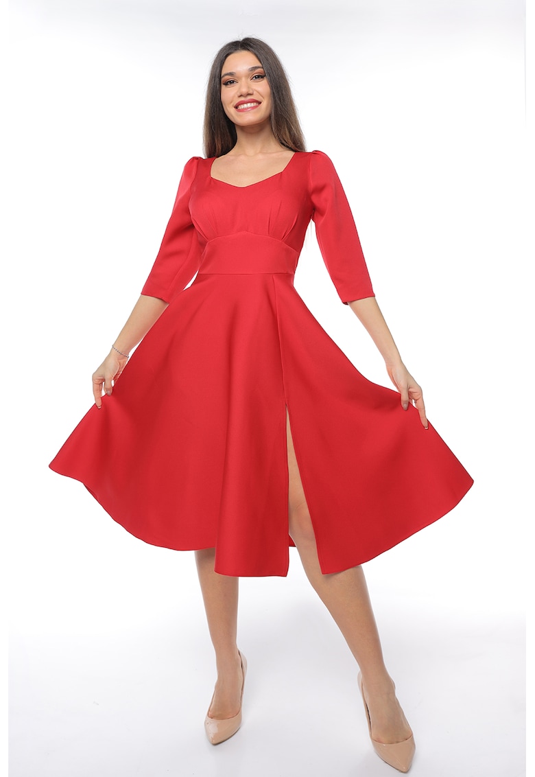 - elastan Imprimeu: uni Croiala: evazat Lungime: midi Decolteu: sweetheart Lungime maneca: maneca medie Detalii: slit lateral Compozitie Exterior: exterior: 95% poliester
