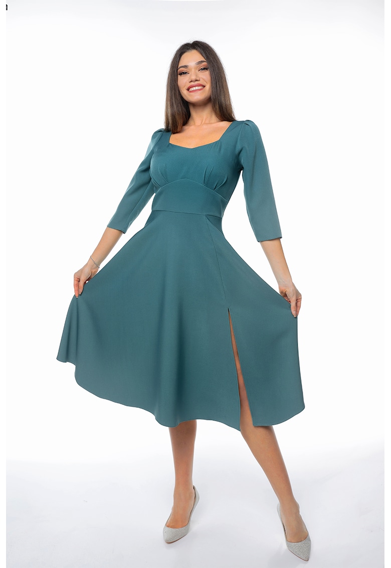 - elastan Imprimeu: uni Croiala: evazat Lungime: midi Decolteu: sweetheart Lungime maneca: maneca medie Detalii: slit lateral Compozitie Exterior: exterior: 95% poliester
