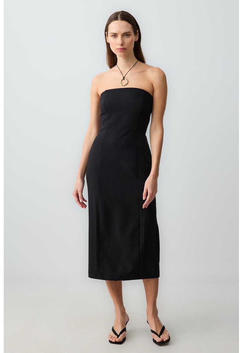 - elastan Imprimeu: dungi Croiala: cambrata Lungime: midi Lungime maneca: fara maneca Detalii: slit pe partea din spate Compozitie Exterior: 87% poliester