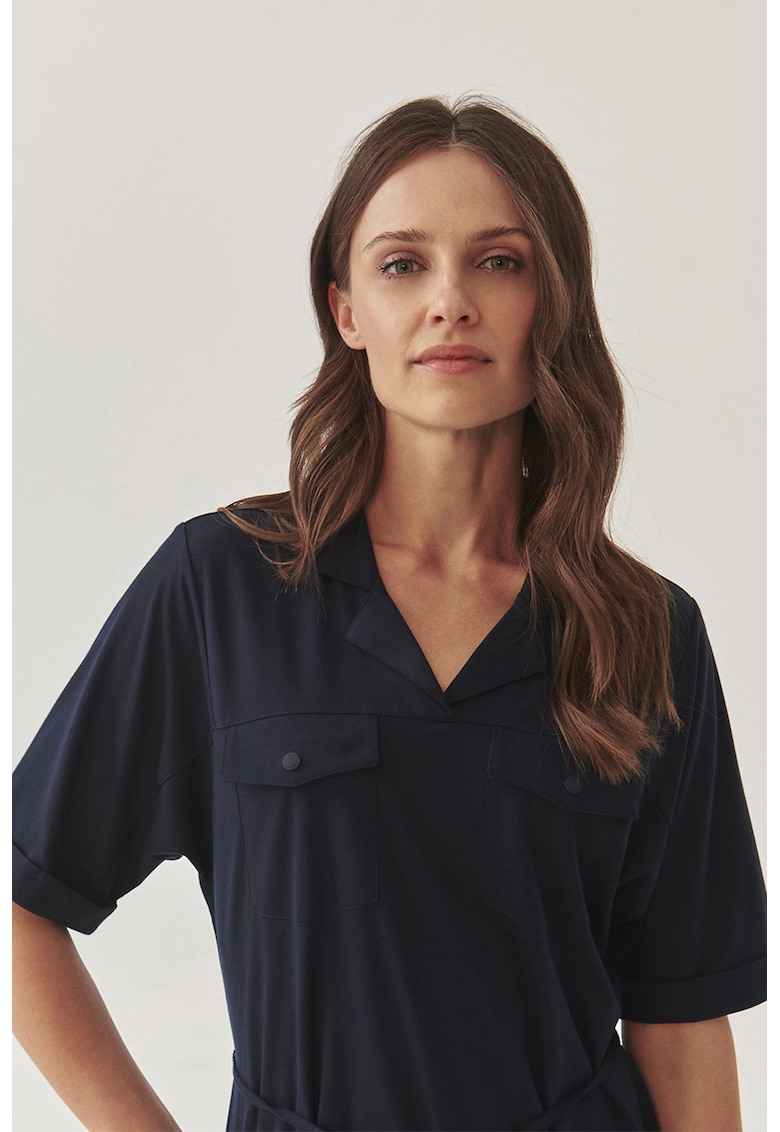 Caracteristici Culoare: albastru ultramarin Stil: casual Material: sintetic Imprimeu: uni Croiala: evazat Lungime: midi Guler: cu revere decupate Lungime maneca: maneca scurta Detalii: snur pentru ajustare in talie Compozitie Exterior: 61% viscoza