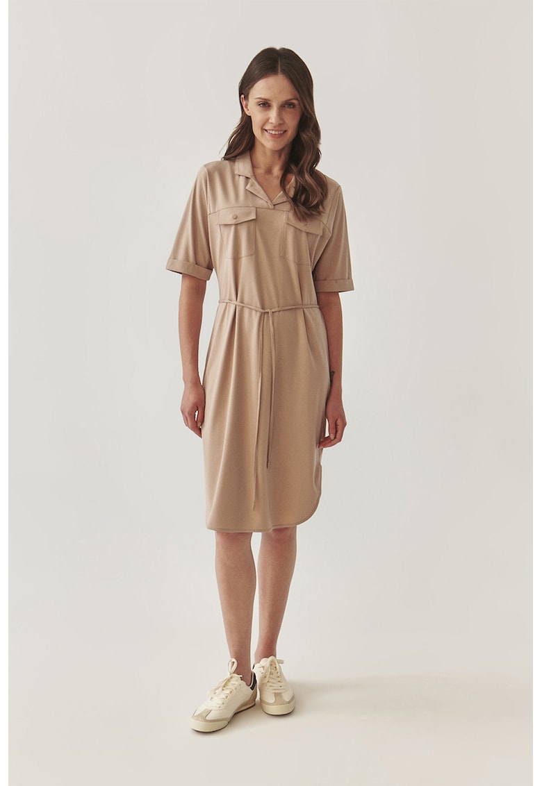 Caracteristici Culoare: maro nisip Stil: casual Material: sintetic Imprimeu: uni Croiala: evazat Lungime: midi Guler: cu revere decupate Lungime maneca: maneca scurta Detalii: snur pentru ajustare in talie Compozitie Exterior: 61% viscoza