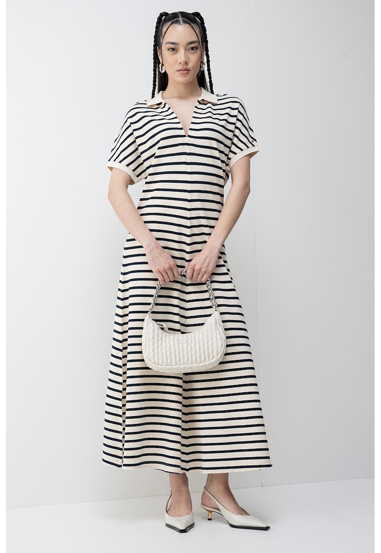 - albastru ultramarin Stil: casual Material: lyocell Imprimeu: dungi Croiala: in a Lungime: midi Guler: clasic Lungime maneca: maneca scurta Compozitie Exterior: 65% lyocell